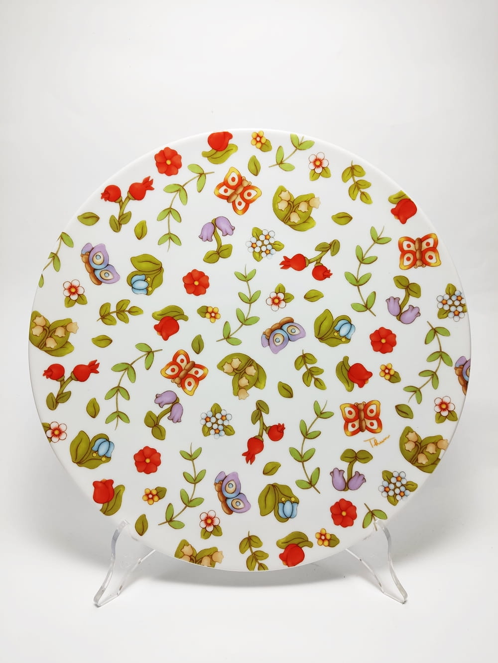 Półmisek okrągły, talerz z motywem kwiatowym. Idealny na różnego rodzaju ciastka, ciasteczka, pierniki, ciasta a nawet tort. Może służyć także do dań wytrawnych. Piękna ozdoba stołu.